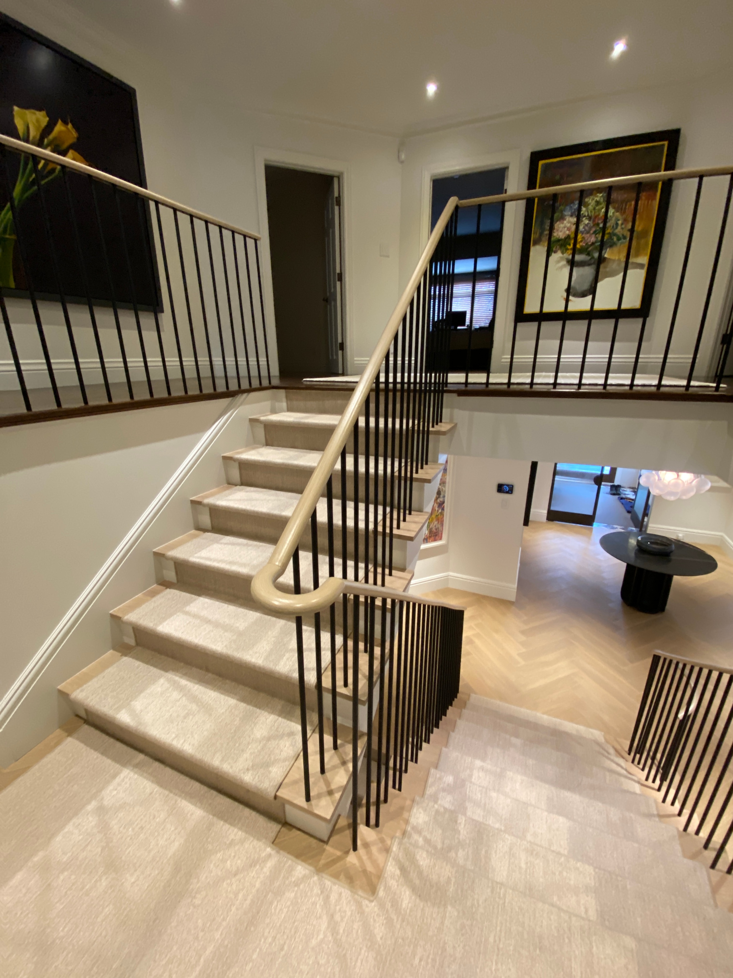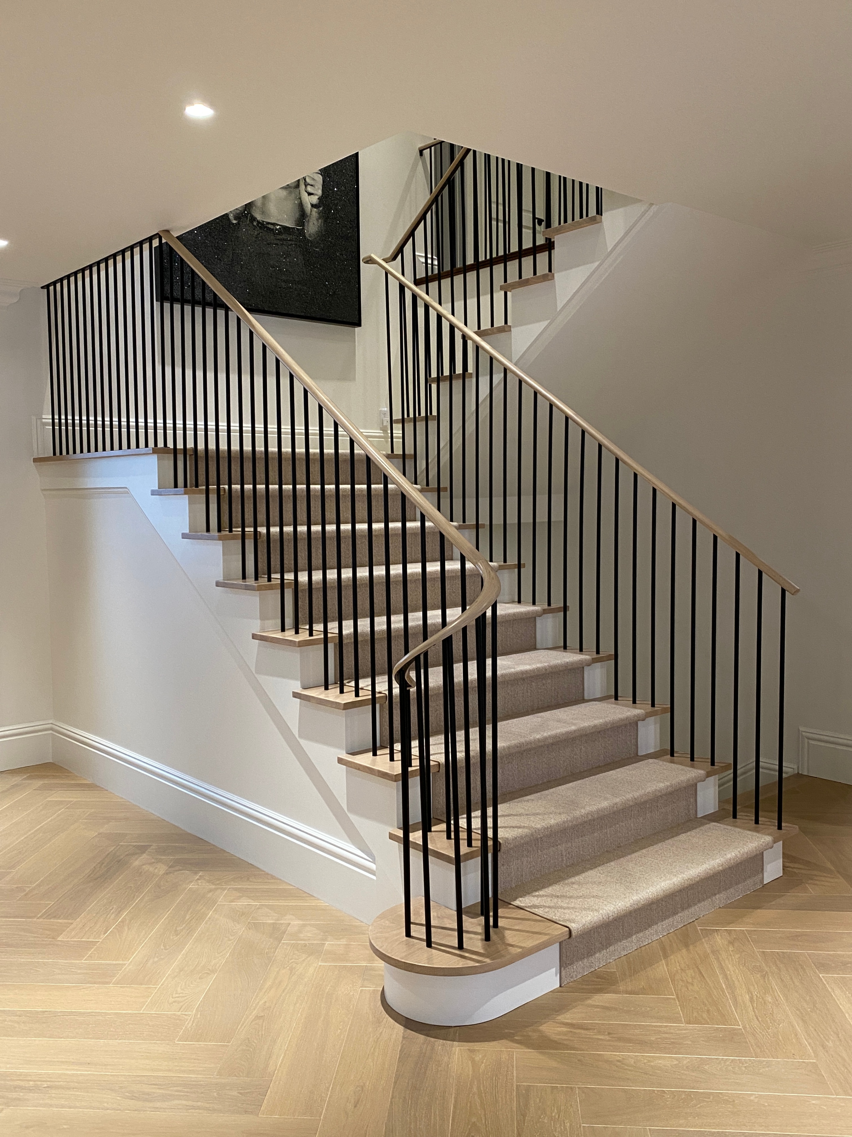 This project features a custom staircase railing system that blends traditional craftsmanship with a clean, contemporary edge. We fabricated and installed slender vertical steel balusters, powder-coated in matte black for contrast and durability. These were paired with custom wood handrails, precisely curved and finished to complement the soft tones of the space. The result is a refined staircase that enhances both the architectural flow and elegance of the home.