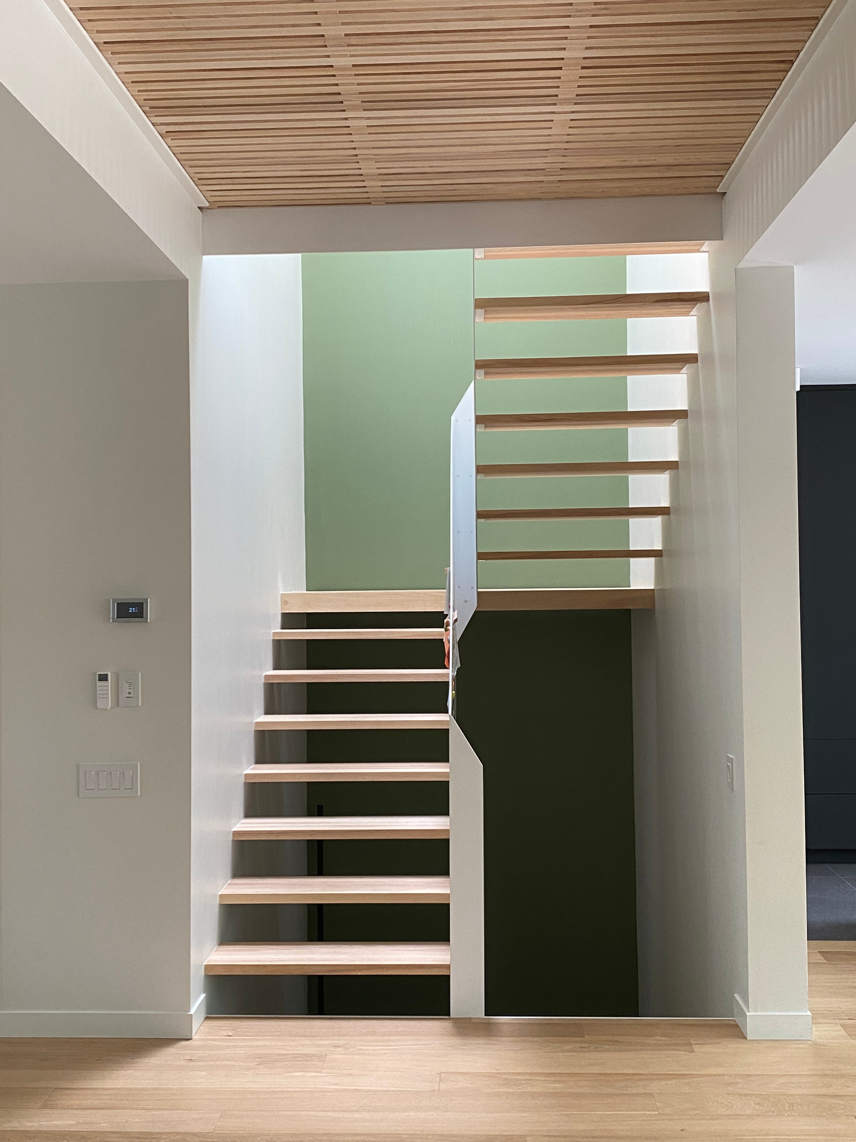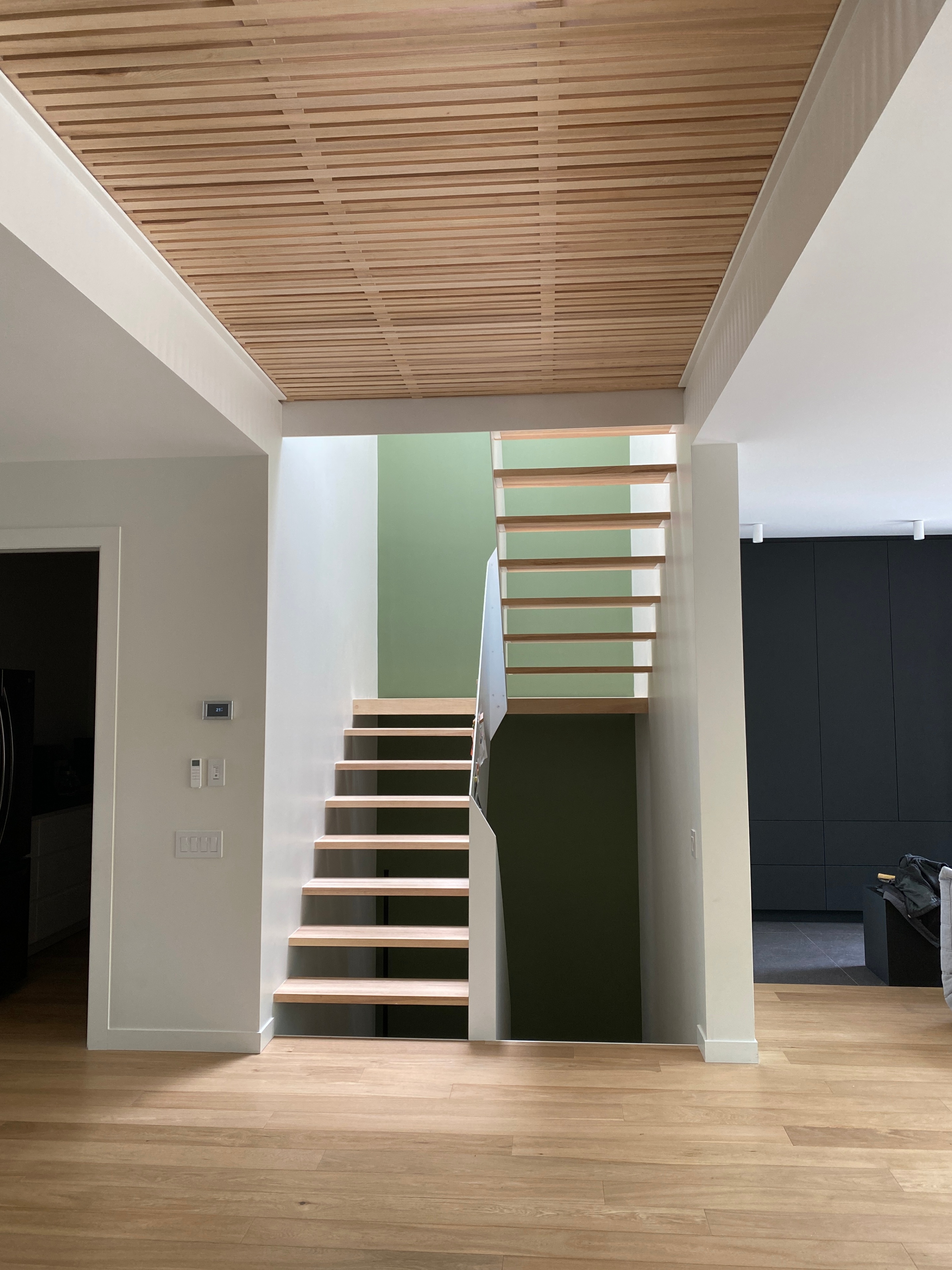 Custom architectural staircase featuring an open slatted white oak floor and a steel structure composed of a stringer and guardrail, finished with white powder coating. This project combines precision fabrication, durability, and a minimalist aesthetic, integrating seamlessly into this residential space in Montreal.