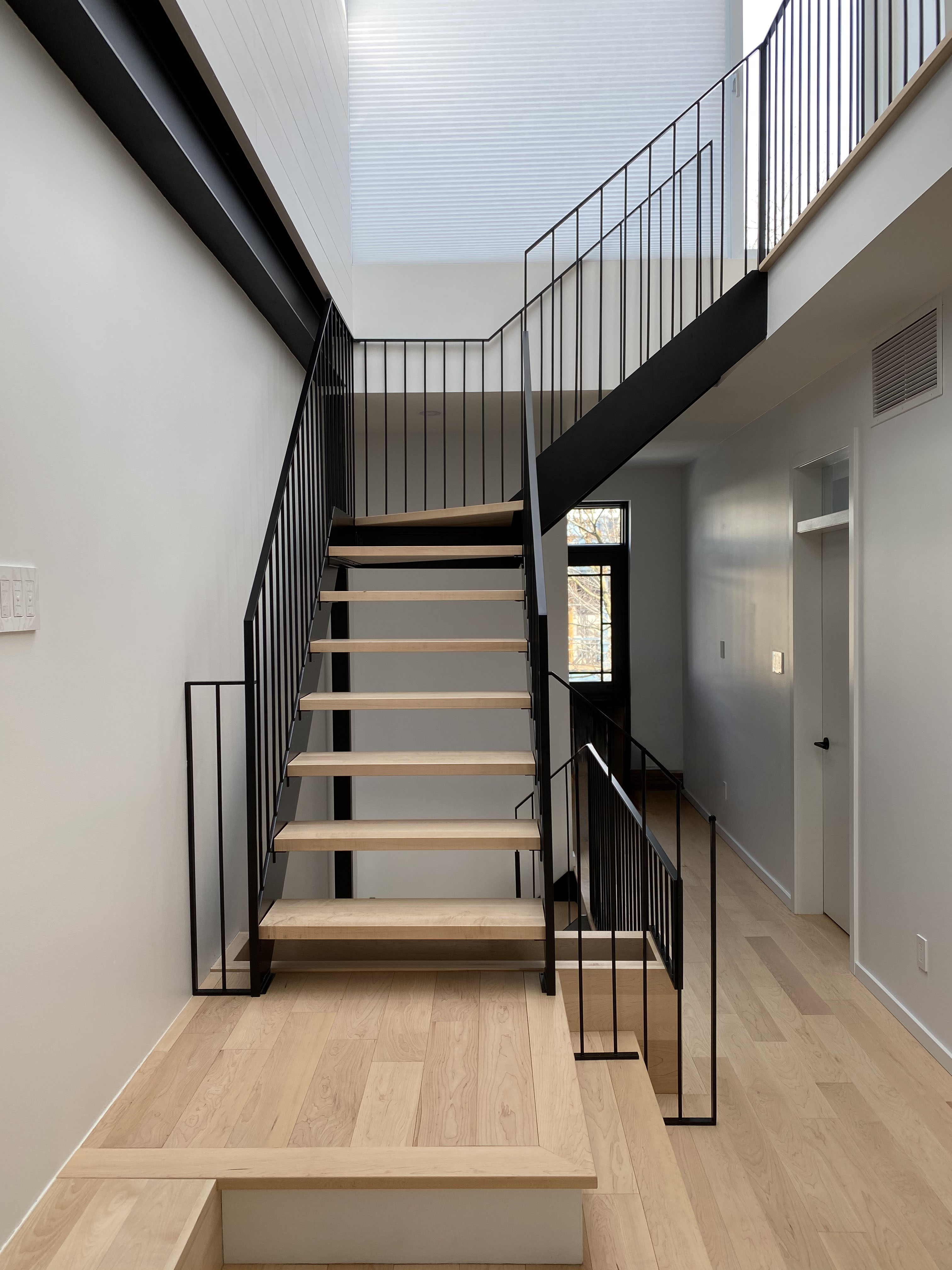 Finished with a durable black powder-coated finish, the open-riser staircase and slim vertical balusters create a modern, light-filled aesthetic. Seamlessly integrated into this Montreal home, the project reflects expert craftsmanship and refined contemporary steel design.