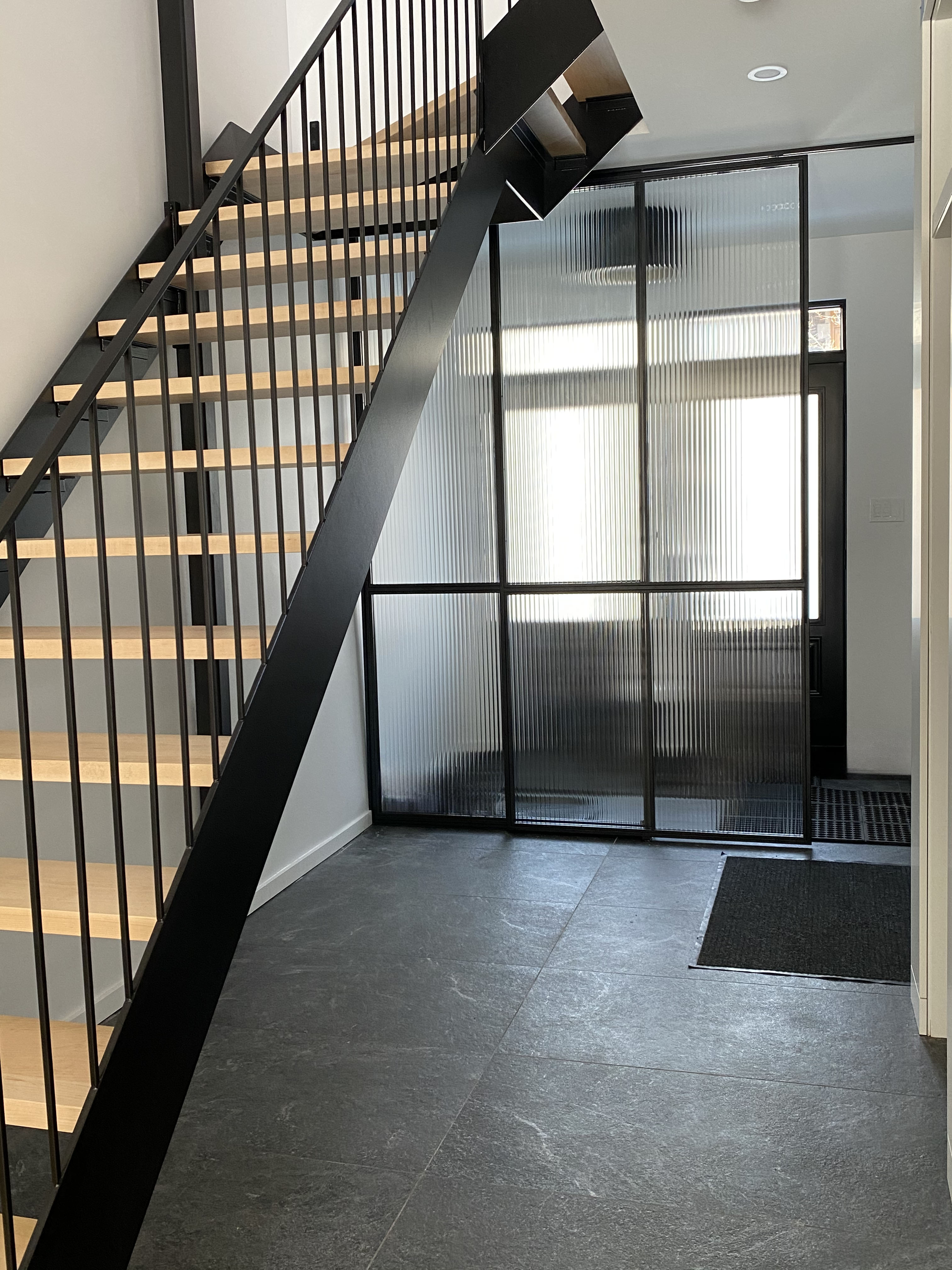 This custom project showcases high-end Montreal steel work, combining a precision-fabricated steel staircase with a matching architectural partition. Featuring solid white oak treads, a sleek steel structure, and a black steel-framed partition with textured glass, the design adds both privacy and visual depth.