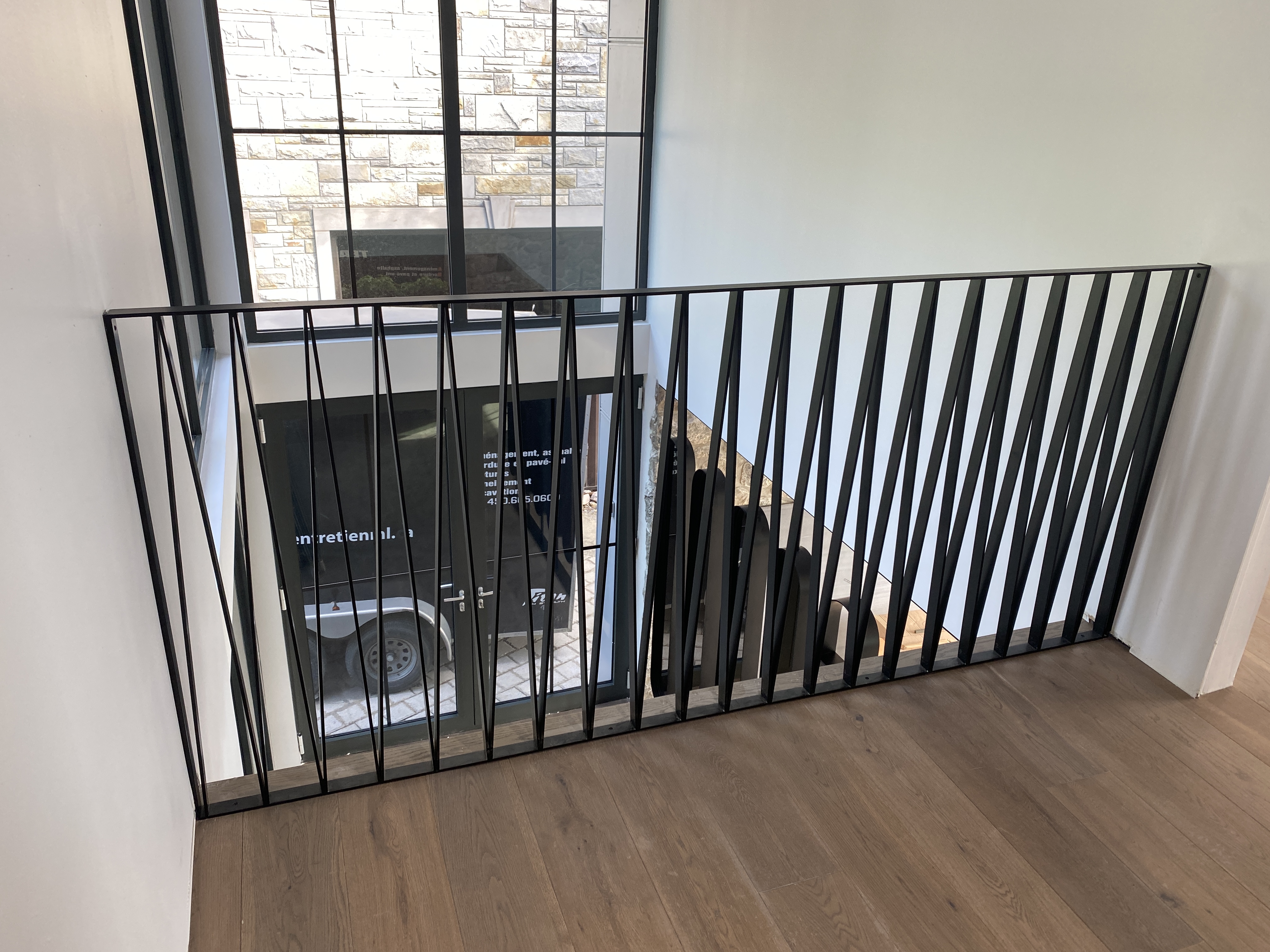This project combined modern metalwork with architectural elegance. We fabricated and installed a striking custom divider made of powder-coated steel and tinted glass, featuring a unique vertical capsule-shaped design. Acting as a sculptural element, it separates the living space without compromising light or openness. We also built a minimalist steel railing system for the staircase and mezzanine, using angled vertical bars for a refined and dynamic visual effect. The result is a cohesive integration of form and function that enhances the space while maintaining an open, contemporary feel.