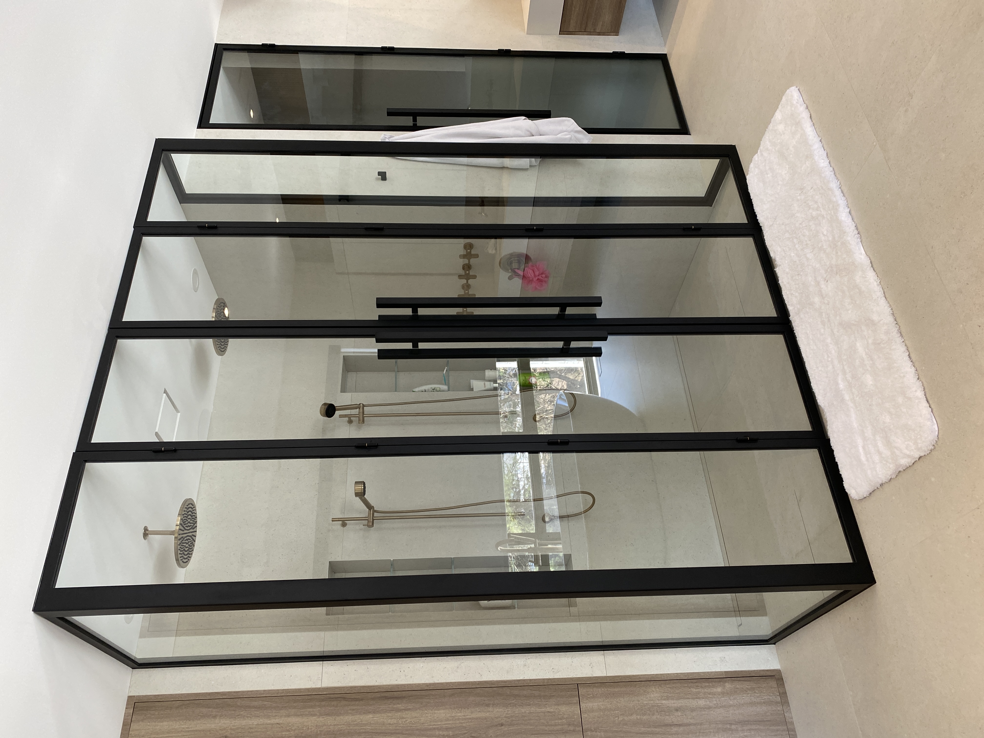 We designed and built a full set of custom steel-and-glass elements for this modern residential project. The work included elegant partitions for a two-person walk-in shower and a matching steel-framed glass door for the adjacent toilet area. We also fabricated a large, arched frame for a custom mirror, seamlessly integrated into the architecture. In addition, several doors and shelving units were created using the same steel structure and clear or frosted glass, maintaining visual consistency throughout the home. All pieces were welded and polished in-house, then sent to a professional paint shop for a durable, powder-coated finish before final installation.