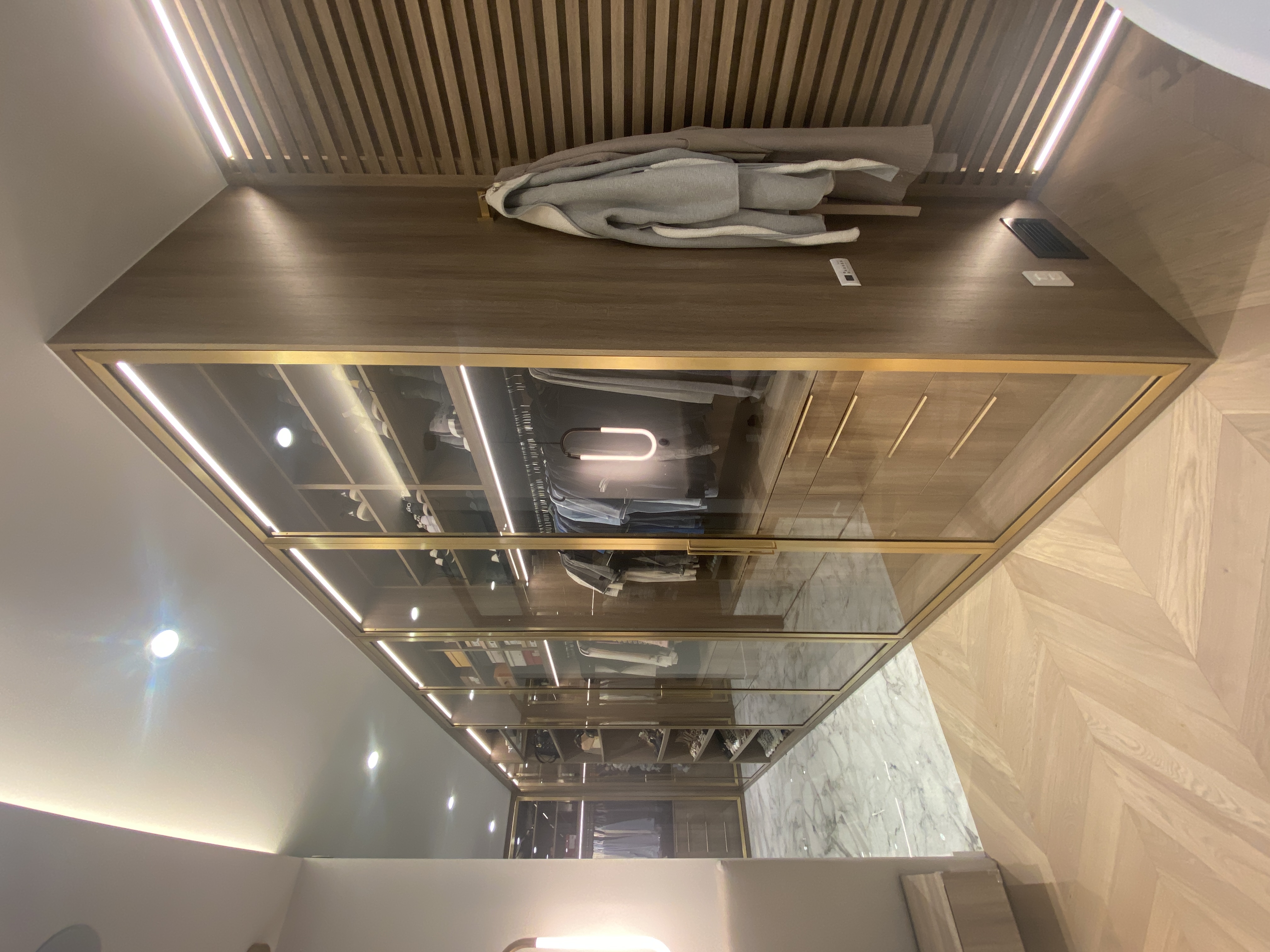 For this project, we delivered several standout custom pieces for a luxury residence. In the walk-in closet, we built steel-framed glass doors finished with a brass plating to achieve a rich, golden look—bringing a refined, high-end touch to the space.